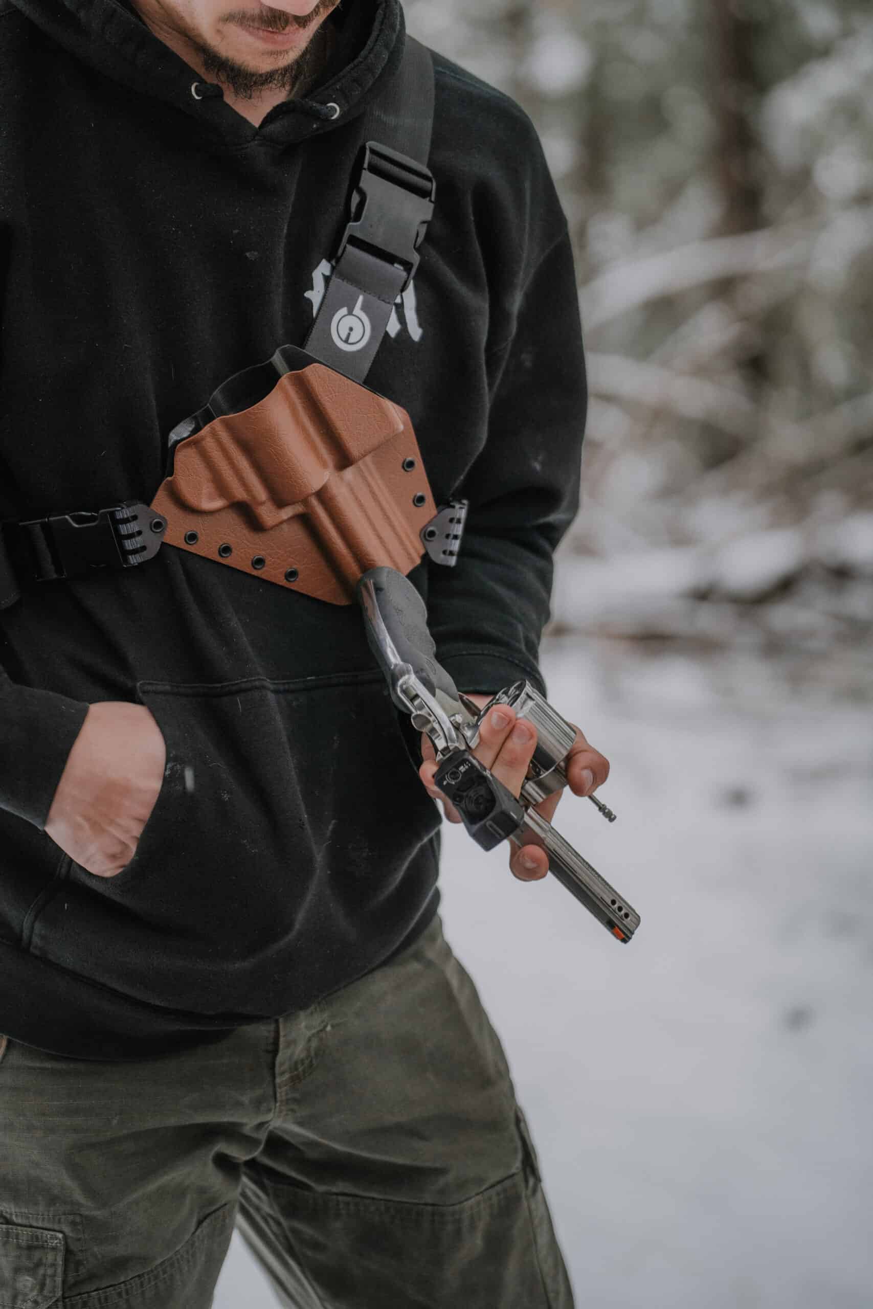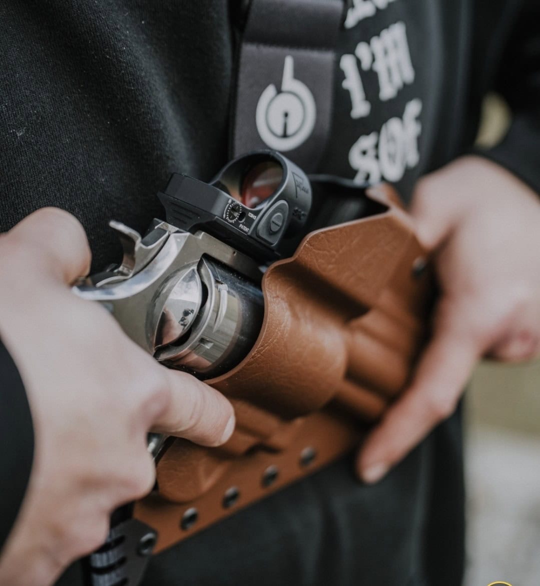 The custom Kenai now supports a range of popular revolvers with optics. This new red dot revolver holster option provides precise clearance for modern optic systems without sacrificing retention or draw speed. Designed for hunters, hikers, and outdoorsmen, it securely fits revolvers equipped with popular red dot sights. Our optic mounted revolver holster design maintains the same comfortable chest carry and rugged durability that has always defined the Kenai Chest Holster.