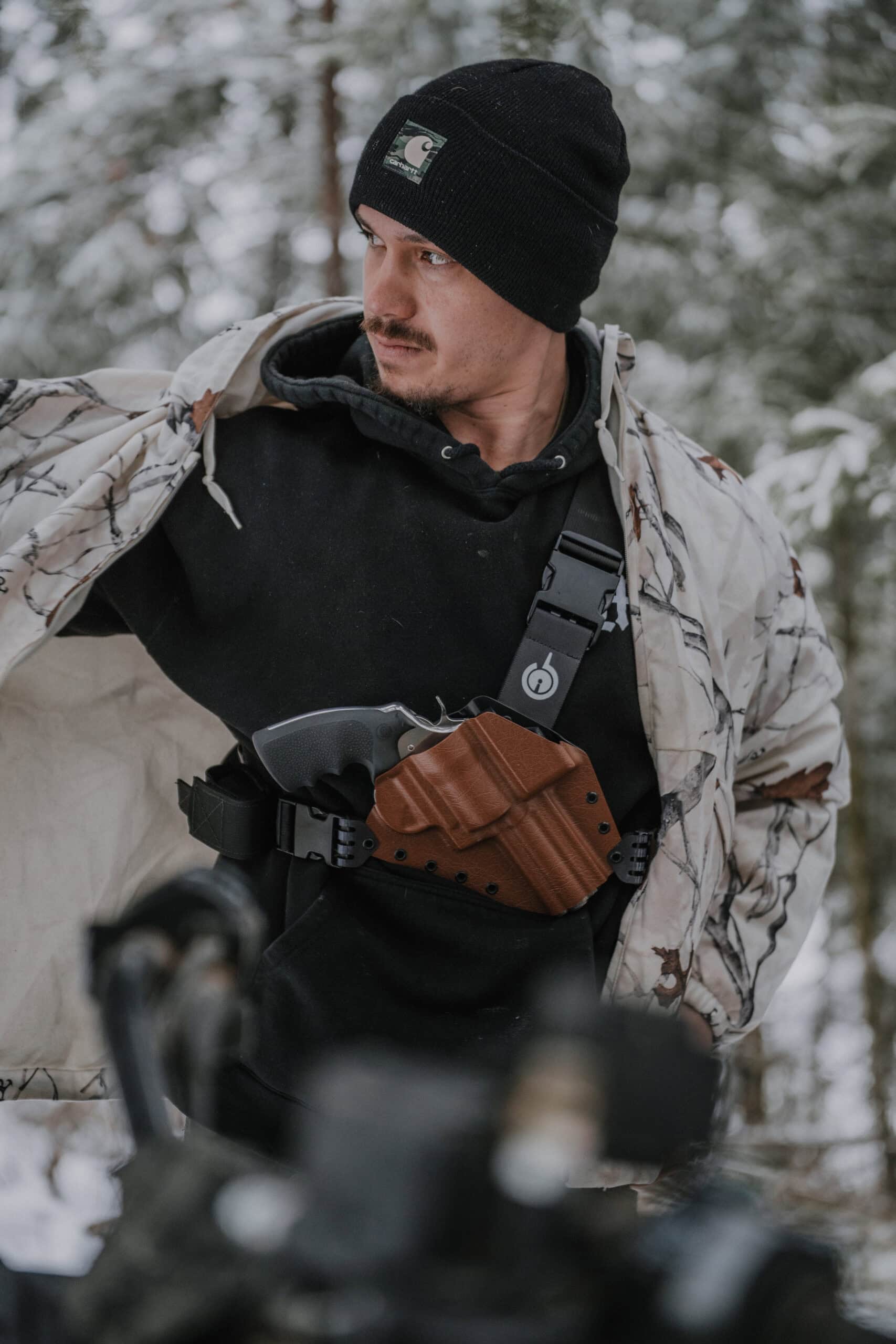 No matter what you’re doing in the backcountry, the placement of the firearm on your chest helps you be a hard target anywhere without compromising your choice of firearm. You can carry as big of a firearm as possible with maximum comfort. The centered position on the chest allows for a quick draw from any position, even when wearing bulky winter clothing or seated in a vehicle.