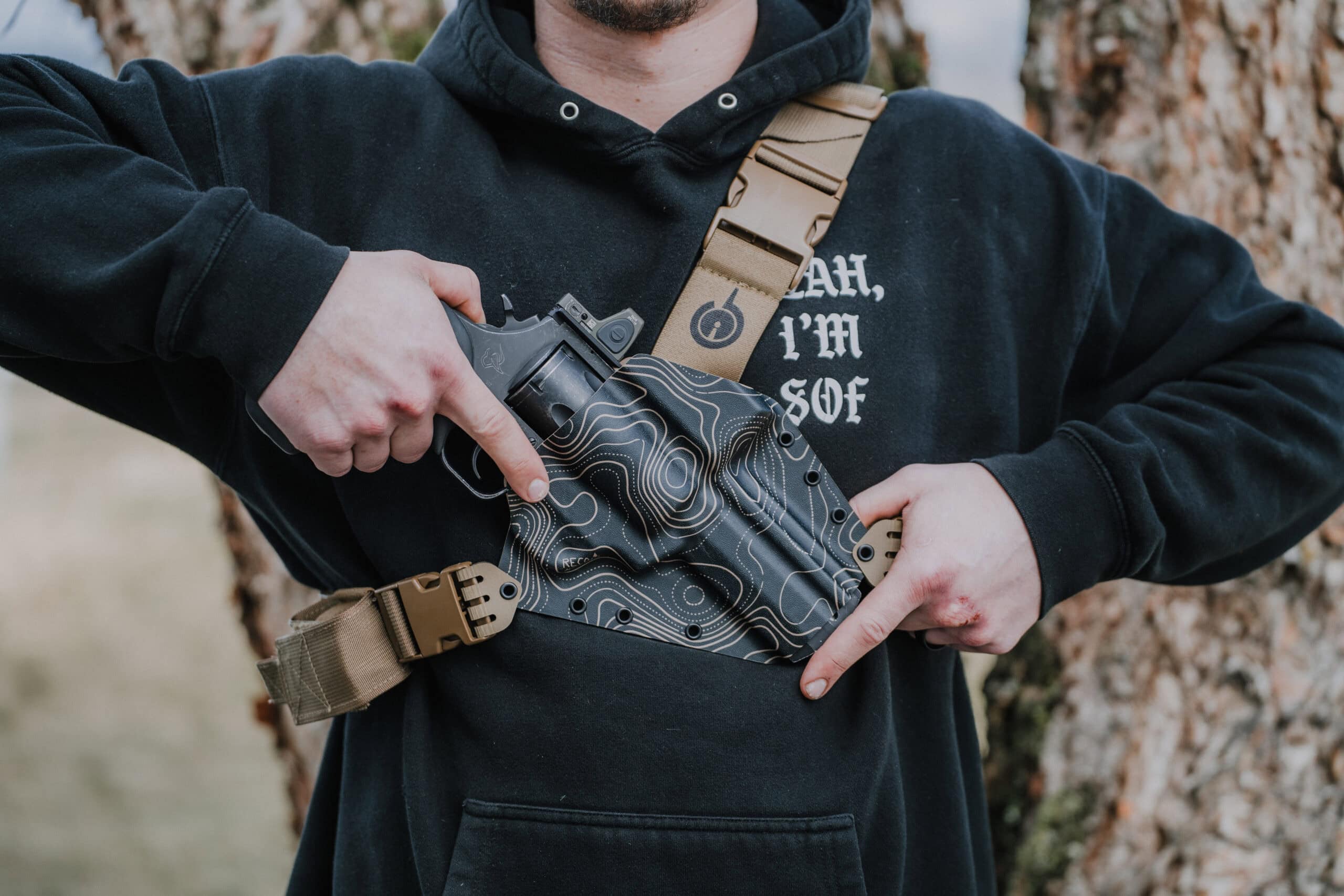 The Kenai Chest Holster was designed as the ultimate way to carry a firearm when hiking, hunting, fishing, or any other outdoor activity.